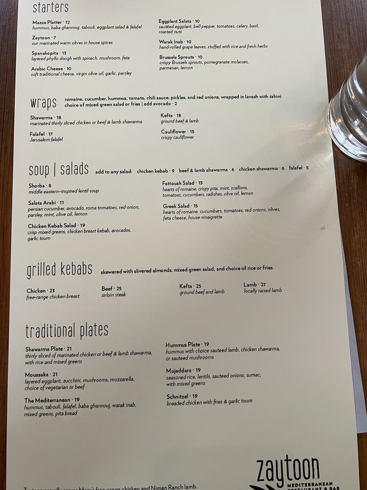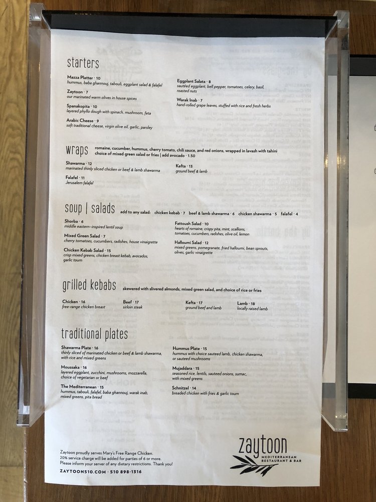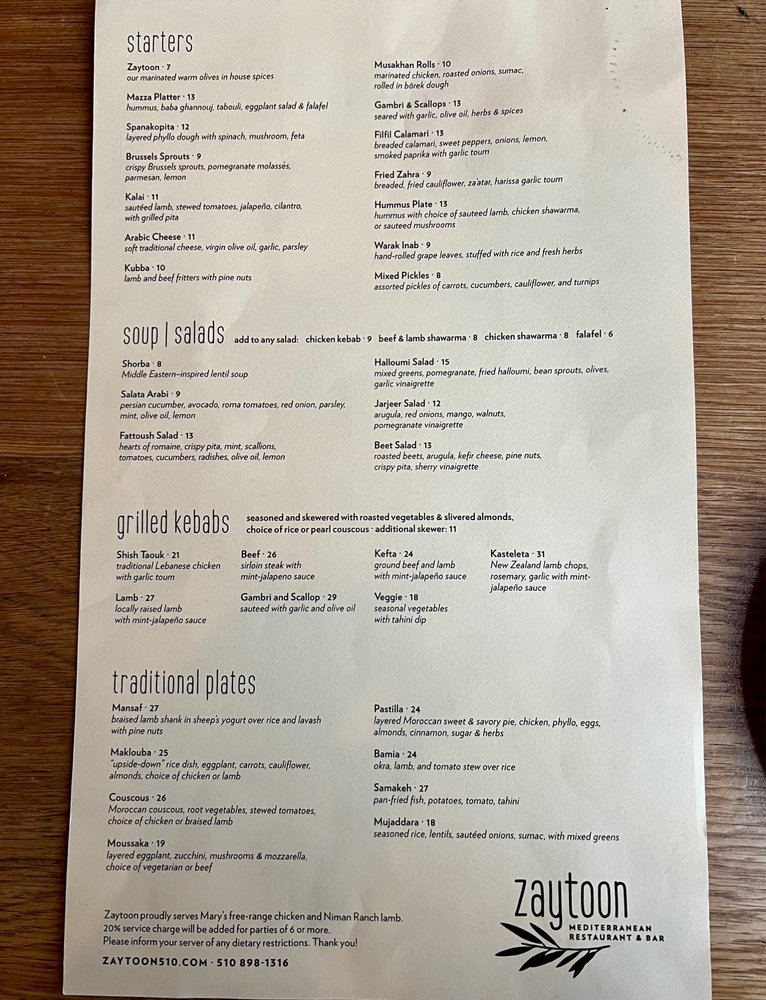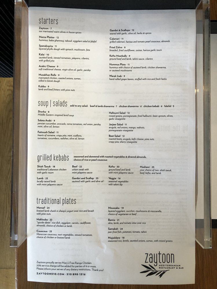 Welcome to Zaytoon Mediterranean Restaurant and Bar, a gem nestled in Albany, CA, where Middle Eastern flavors come alive. The menu showcases a delightful blend of traditional dishes and vibrant salads, perfect for lunch or dinner. Start your meal with the Shorba, a heartwarming lentil soup, or the Fattoush Salad bursting with fresh veggies and crispy pita. For the main course, savor the succulent Chicken Kebab or the rich Moussaka, which exemplify the restaurant's commitment to quality ingredients and authentic recipes.